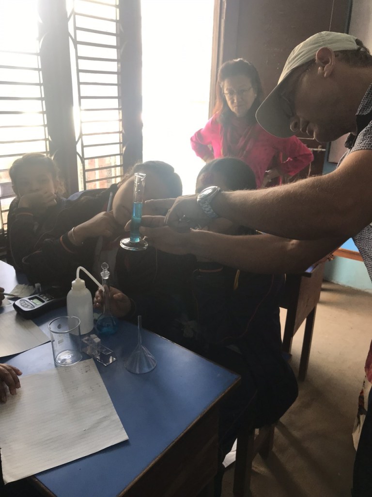 Nepal is a landlocked developing country in south Asia between China and India. It is home to 25 million people of various ethnicities including Gurkhas and Sherpas, and to the tallest mountain range in the world. The Bristol ChemLabS outreach was performed at the Loyola Secondary School in Kathmandu, in collaboration with the Department of Chemical Science and Engineering at Kathmandu University (KU). The outreach event was sponsored through the United Kingdom’s Natural Environmental Research Council grant NE/P013104/1 impact fund. A colorimeter experiment was selected based on the its applications of principles in physics, chemistry and mathematics. Also, the colorimeter instruments are portable, and the chemicals/glassware needed are readily available.