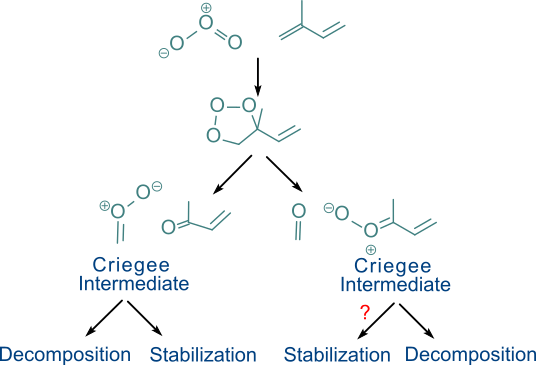 Criegee Intermediate Chemistry: Alkene ozonolysis is an important process in the troposphere which leads to production of OH radicals and non-volatile organic compounds that can condense to form aerosol particles. Ozonolysis results in clevage of the alkene double bond producing Criegee intermediates and ketone products. In tropospheric conditions most of the Criegee intermediates decompose, however some fraction can be stabilized. These stabilized Criegee intermediates, SCI, have been recently shown to undergo bimolecular reactions with important traces molecules such as H2O, SO2 and RCOOH. However there is still significant uncertainity over yields of SCI particularly for larger biogenic SCI from ozonolysis of isoprene and terpenes. We are interested in directly measuring the SCI yields using novel scavengers and proton transfer mass spectrometry.